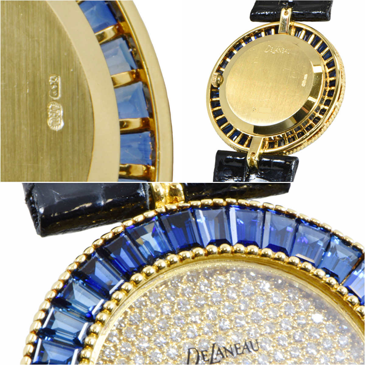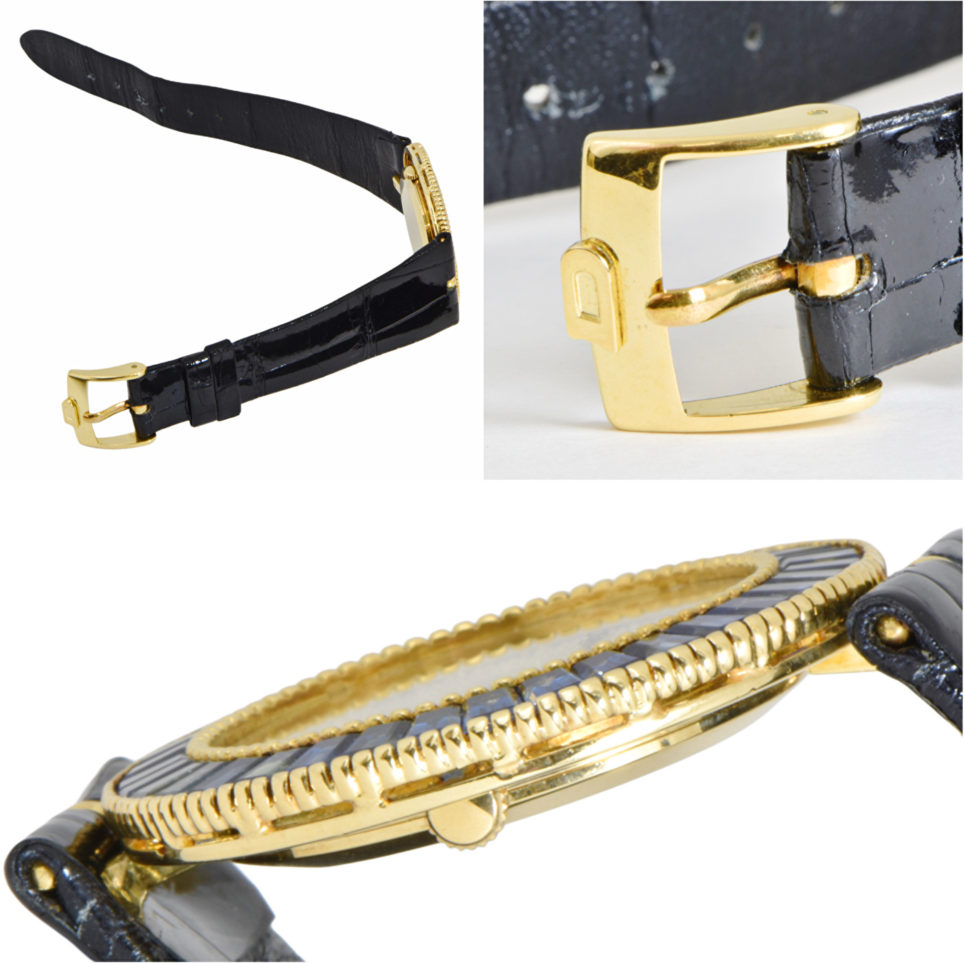 | 仕様 | 非防水、ベゼルバゲットサファイア巻き、アリゲーターストラップ、スチール製金メッキビジョウ |