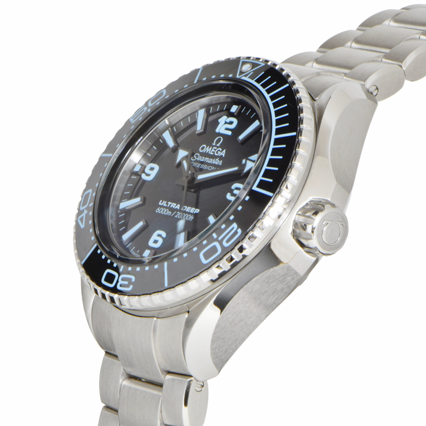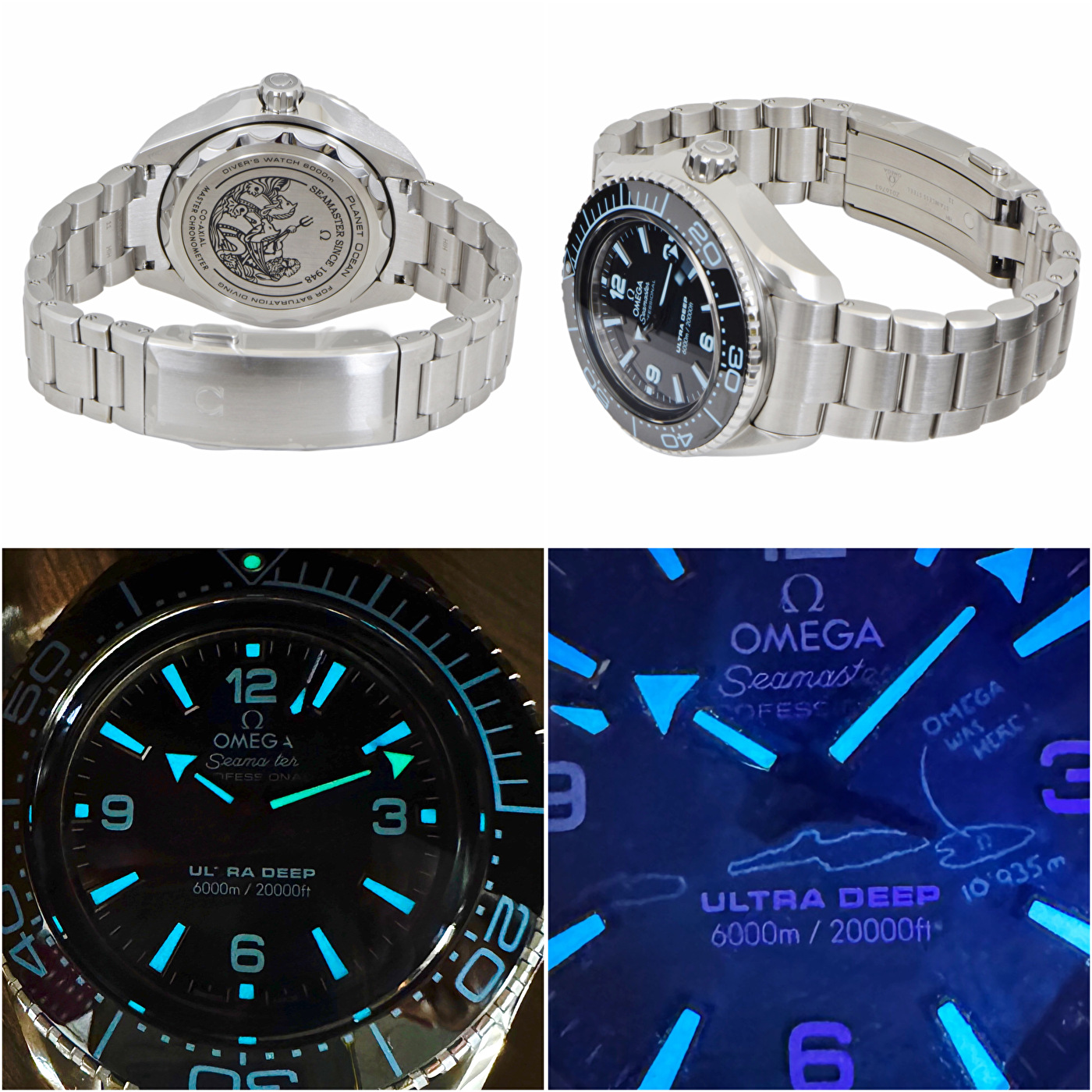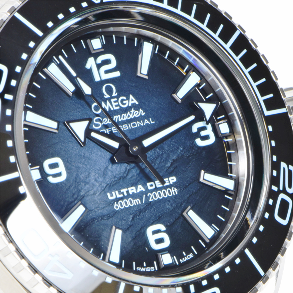| 文字盤 | ブルー UVライトを当てると、チャレンジャー海淵にある西、中央、東の3つのプールが示され、潜水の世界記録である10,935メートルと「OMEGA WAS HERE」の文字が浮かび上がります。 |