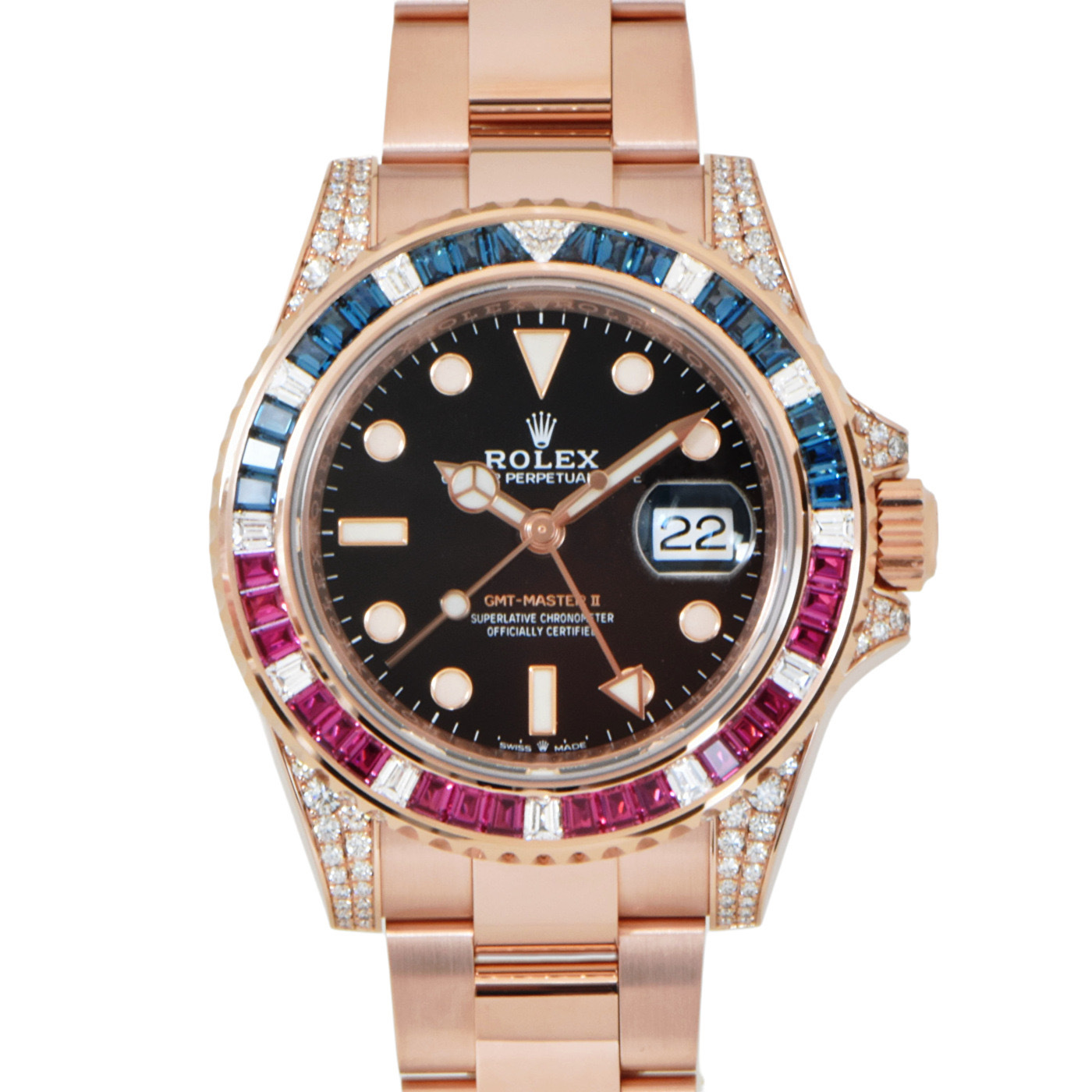 中古 ロレックス GMTマスターII エバーローズゴールド ルビー/サファイアバゲット巻き